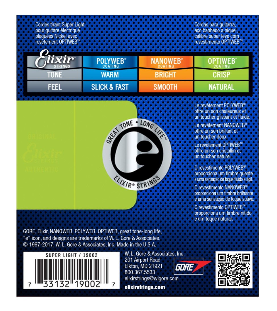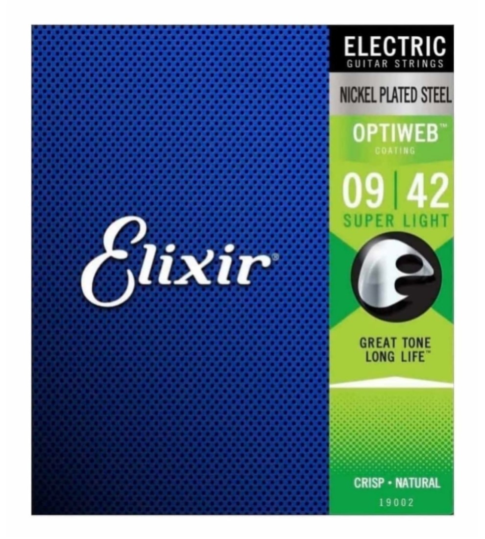 1 Set (6 strings) of Super Light Gauge Elixir Optiweb .009 to .042 Electric Guitar Strings. The new Elixir Optiweb string offer the feel and tone of an uncoated string, but with a far superior longevity.