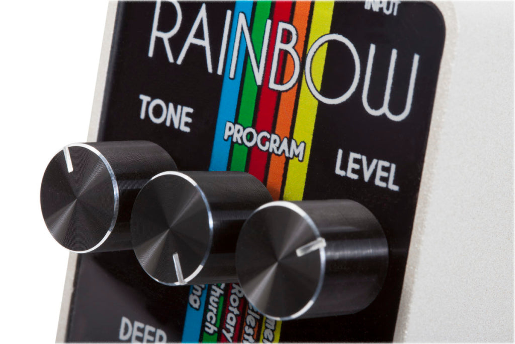 The Foxgear Rainbow, like all other Foxgear pedals, keeps the signal path 100% analog, with audio capacitors (no SMD) in the signal path and true bypass relay, which avoids any undesired effect to your tone while running in front of your amp or in the FX loop. At the core of the Rainbow is the upper central selector that works in synergy with the “Multi” control. This control has specific yet differing roles depending on the algorithm selected, and Tone and Deep controls work to help you to reach unexpected nuances in any algorithm.