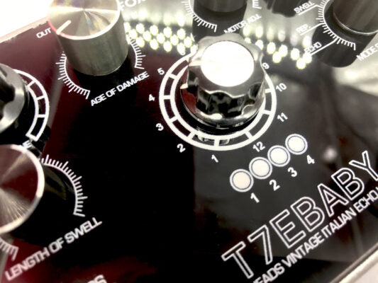 Motor Speed adjust: along with the other cool features of the old Echosex Baby, we’ve added this control, that let you increase the overall delay time, you can mimic a slowered speed of the magnetic drum. This allows the FOXGEAR T7EBaby over 800ms of long, lush delay, keeping the 4 heads in sync, no matter what combination of head you are using.